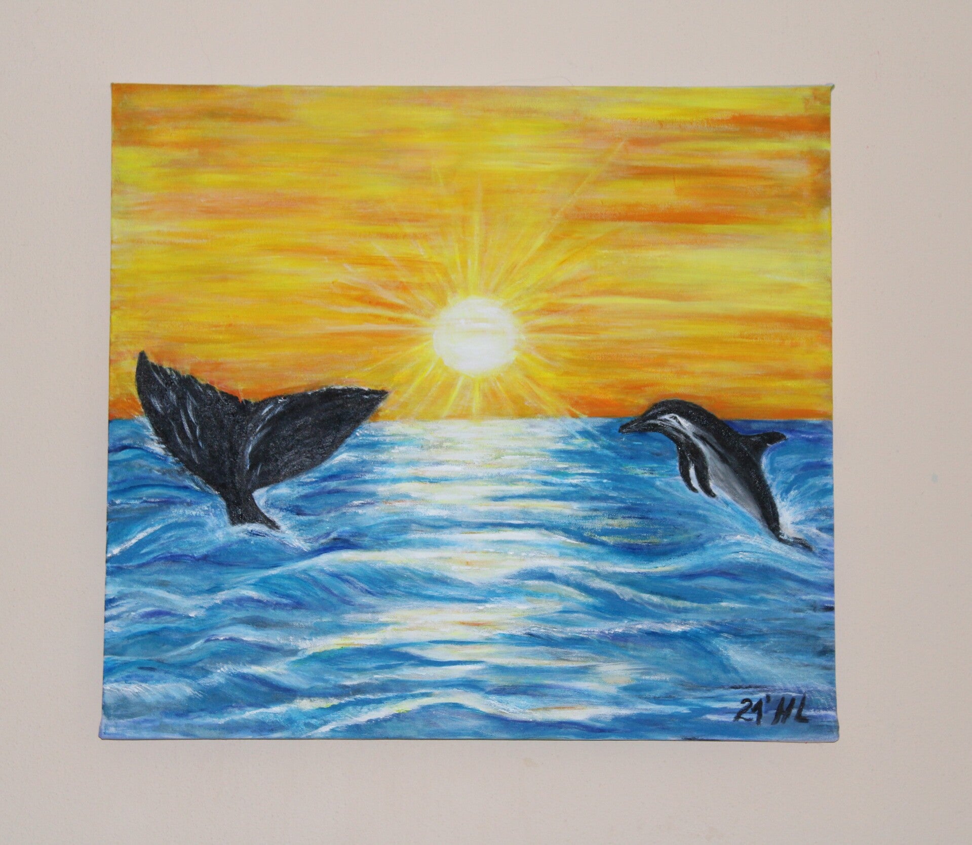 In diesem Gemälde habe ich mit Acrylfarben gearbeitet, um eine Szene einzufangen, die tiefe Verbundenheit und Freude ausstrahlt. Das Bild zeigt zwei Delfine bei Sonnenuntergang, die spielerisch aus dem Wasser hervorspringen. Die warmen Farben des Himmels und die dynamischen Wellen vermitteln ein Gefühl von Hoffnung und Freiheit. Dieses Kunstwerk bringt eine lebendige und inspirierende Energie in jedes Zuhause, erinnert uns an die Schönheit der Natur